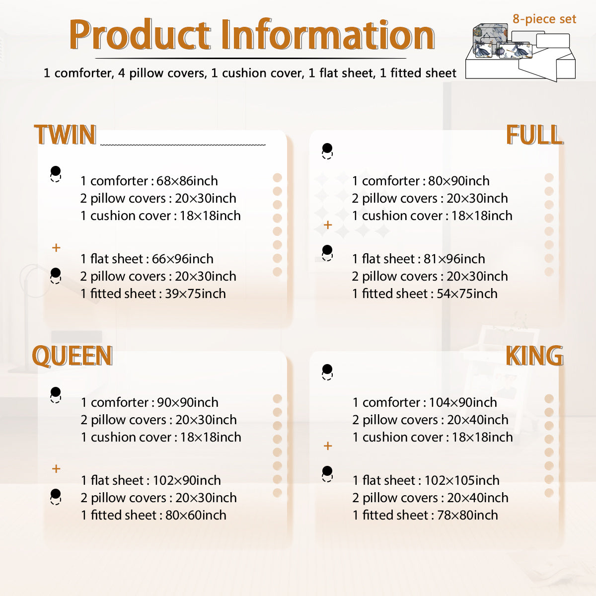 Package Includes: 1 Comforter +1 Pilow Cover+1 Flat Sheet+1 Fitted Sheet+4 Cushion Cover