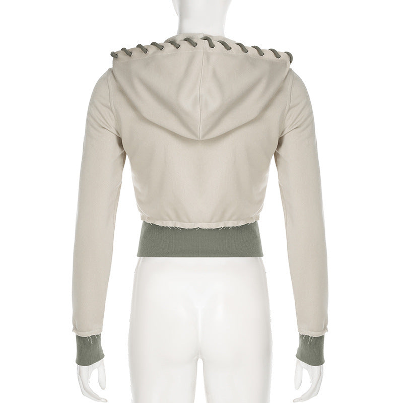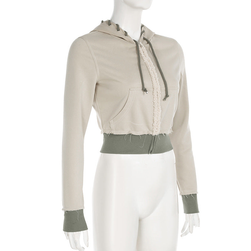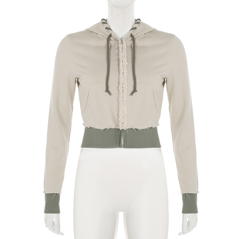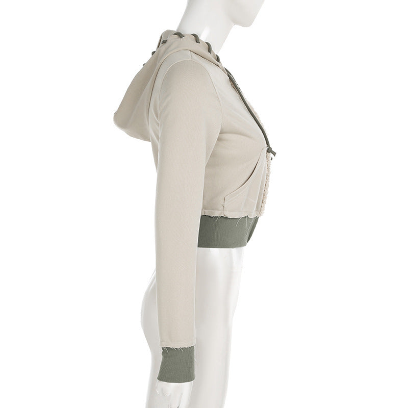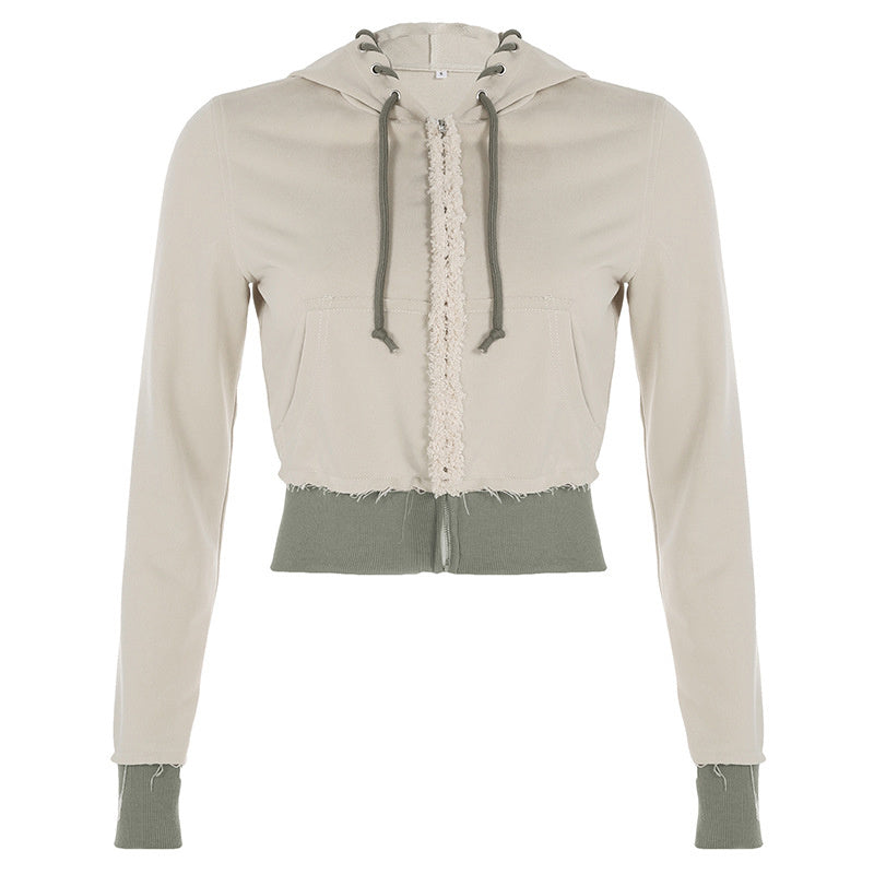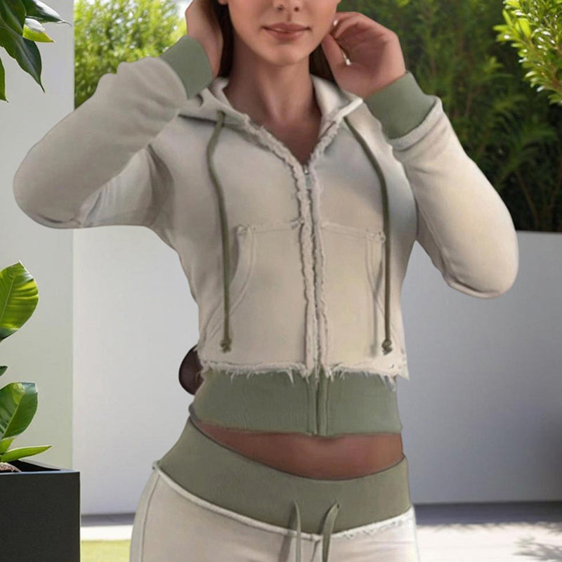 Women's Color-Blocked Zipper Long Sleeve Frayed Design & Pocket Drawstring Hooded Cropped Jacket Spring&Fashion Casual